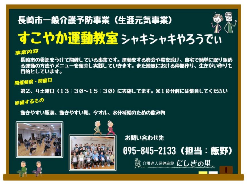 すこやか運動教室は、にしきの里が長崎市の委託を受け実施しており、平成19年6月以来、13年間、皆様の体力づくりのお手伝いをさせていただいております。現在新型コロナウィルス感染対策のため、登録いただいている方を2つにわけ(月に1回の頻度)実施させていただいております。