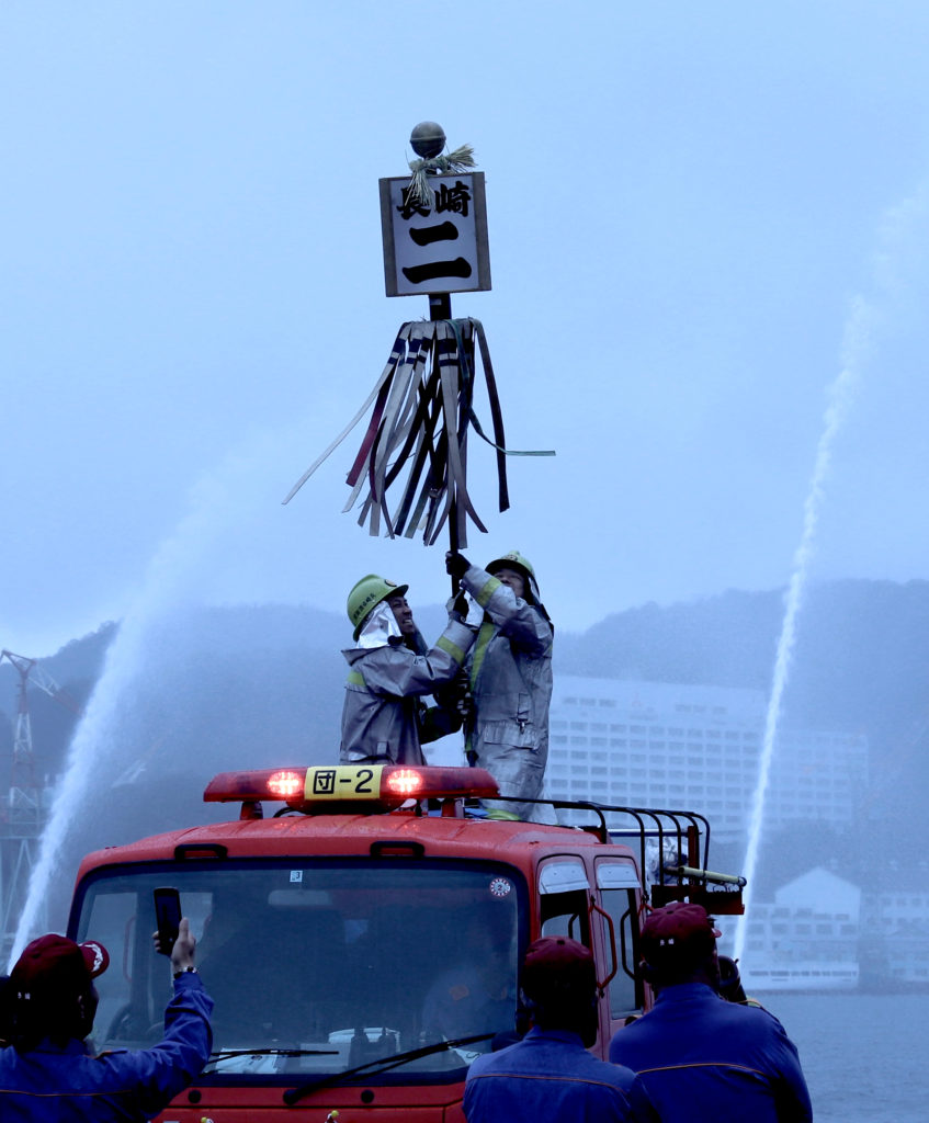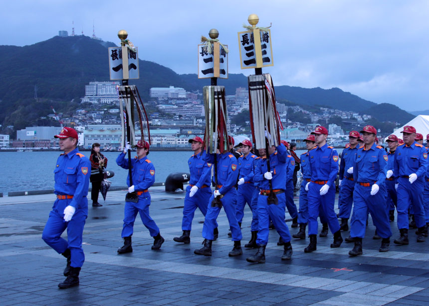 明けて1月7日、水辺の森公園にて行われた長崎市の消防出初式に消防2分団(管轄:西町・ 西北・西浦上中央地区)も参加し、パレードの後一斉放水を行いました。当日はあいにくの雨交じりでしたが、力強い 行進、放水で今年1年の防火、防災を誓いあいま した。